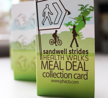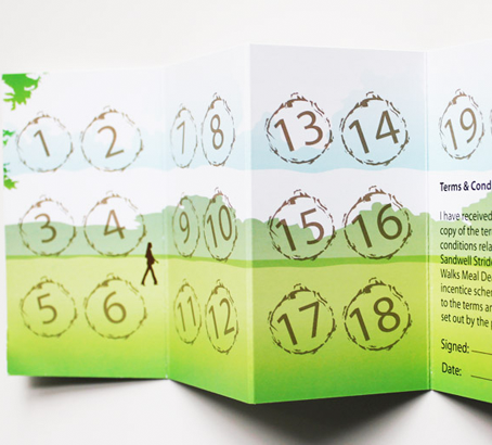 Project 03: Sandwell Strides Health Walks Meal Deal Collection Card: Mytime Health was looking to design a special meal collection card for the Sandwell Stride Health Walks meal deal incentive scheme, with space for 20 stamps.